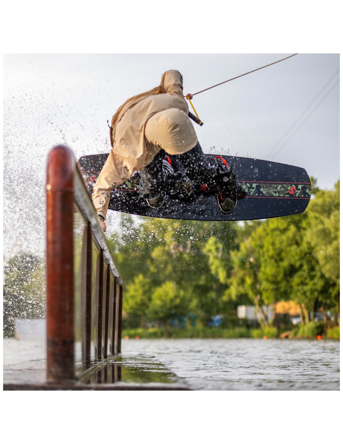 La planche de wakeboard Slingshot est équipée de rails chanfreinés, ce qui signifie que les bords extérieurs de la planche sont légèrement relevés d'environ 4 à 5 mm. Cette conception crée une petite zone tampon entre les bords de la planche et les surfaces inégales des rails, ce qui permet de protéger les bords de la planche contre les chocs et les abrasions.